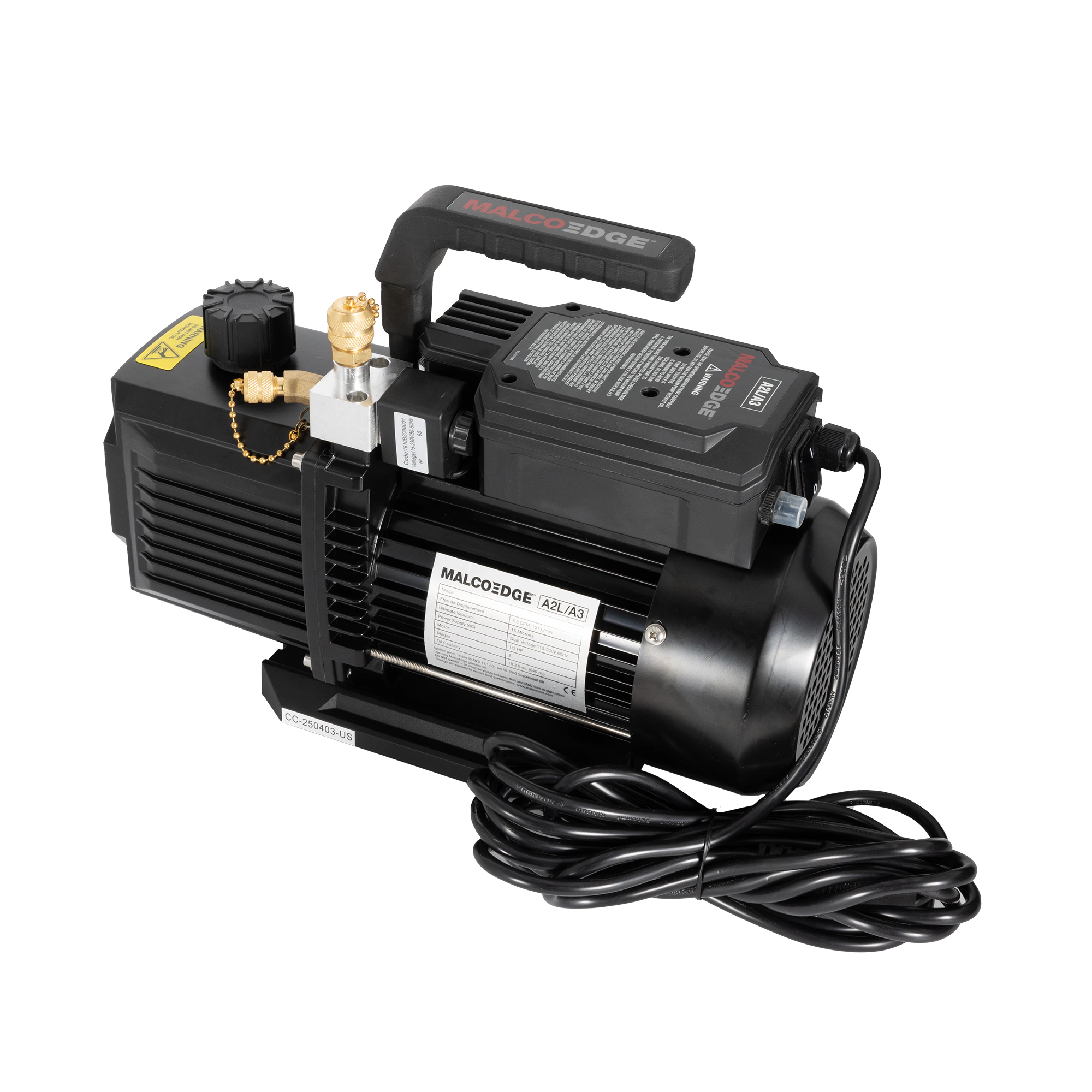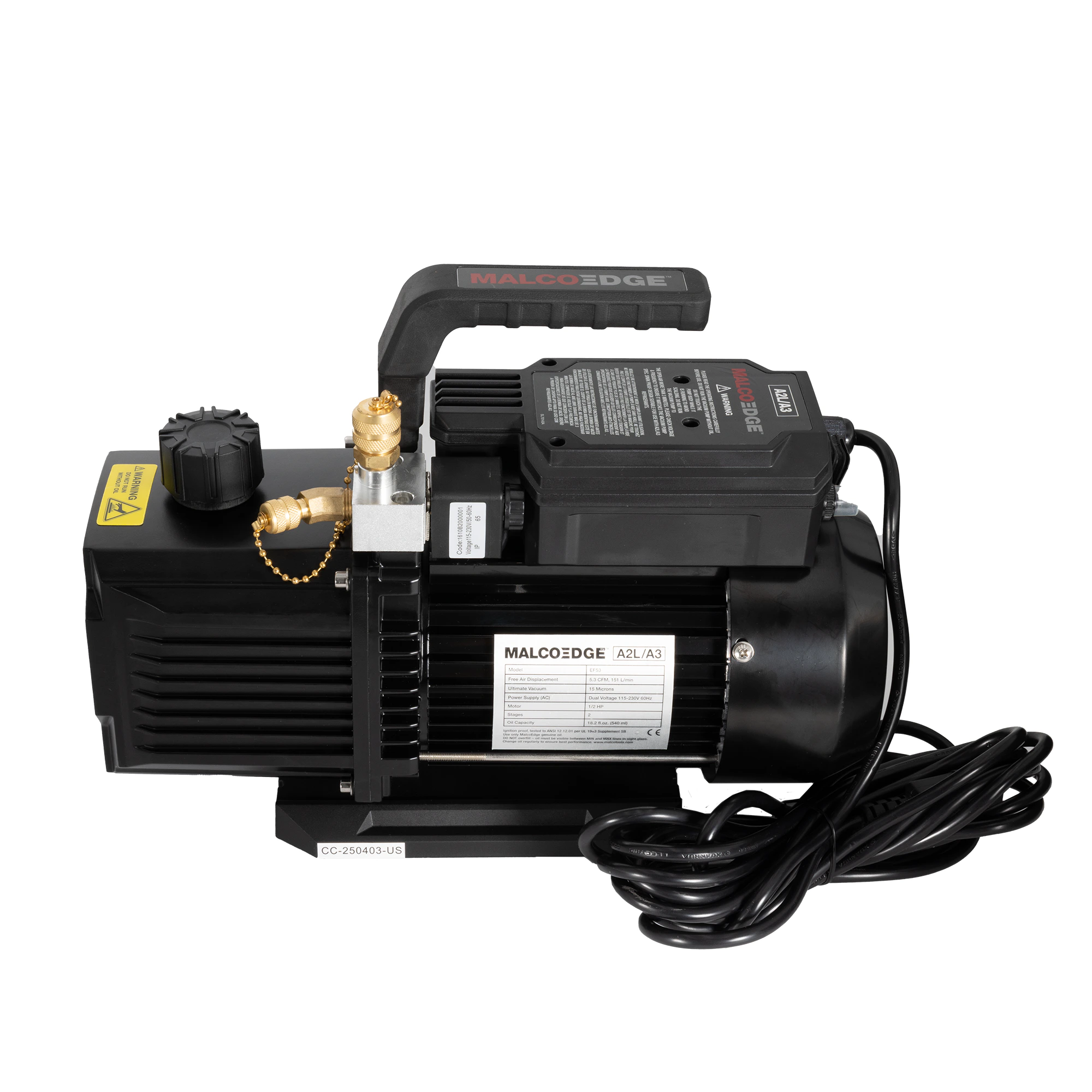 - 1/2 horse power with 5.3 CFM evacuation flow rate provides the power needed to achieve ultimate vacuum levels quickly when paired with MalcoEdge™ TurboFlow vacuum hoses