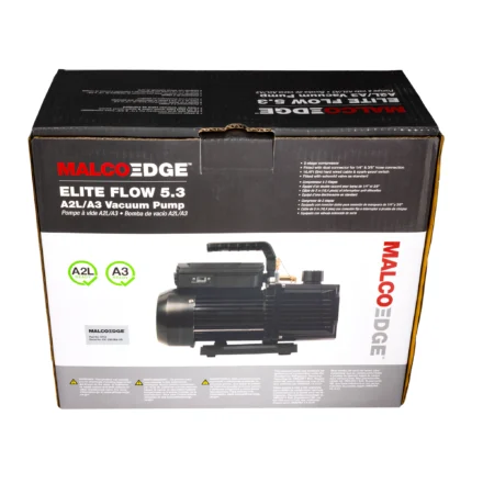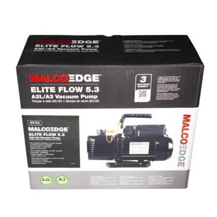 The MalcoEdge™ EF53 Elite Flow Vacuum Pump is engineered for high-capacity evacuation of residential, commercial, and industrial HVAC systems. With a 5.3 CFM evacuation rate, this heavy-duty vacuum pump offers fast, reliable evacuation even in large systems. It is fully compatible with all standard, A2L, and A3 refrigerants, making it ideal for use with today’s refrigerant blends. The EF53 features a rugged housing, quiet operation, and precision-engineered internals for long-lasting performance in demanding environments. Whether you’re evacuating large heat pumps, rooftop units, or refrigeration systems, the EF53 is built for speed, safety, and durability.