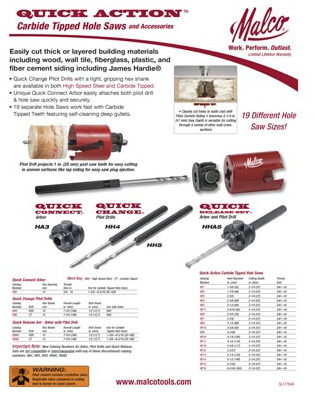 The full selection of “Quick Action” Hole Saws (19 sizes in all) share a unique “Quick Connect” Arbor design that is compatible with industry standard 5/8-18 hole saw threads. The arbor easily holds or releases Malco “Quick Change” Pilot Drills. The arbor’s quick release feature also ejects saw plugs with ease!