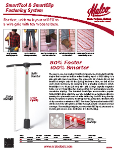 The easy-to-use, top-loading SmartTool stapler is used to install SmartClip staples that secure an in-floor radiant heating layout of PEX tubing to a wire grid with foam board base. The ergonomic 38-1/2-inch (98 cm) tall SmartTool weighs only 6.1-lbs (2.8 kg) and saves time, as well as the user’s back and knees, by operating from a standing position to attach SmartClips to a 10-ga (3.5 mm) wire grid. A large capacity magazine holds over 40 SmartClips (two loading strips) for uninterrupted, smooth, one-stroke stapling. The installed SmartClips accommodate popular 1/2-in PEX tubing, which the user also installs from a standing position by pressing into place with one foot while distributing the PEX along the clip layout. The plastic-to-plastic, SmartClip-to-PEX connection eliminates risk of clip corrosion or abrasion of PEX. The SmartClip keeps the inserted PEX elevated over the wire grid to provide thorough concrete encasement and coverage. The resulting straighter, more accurate PEX layout placement on the wire grid ensures even distribution of in-floor heating.